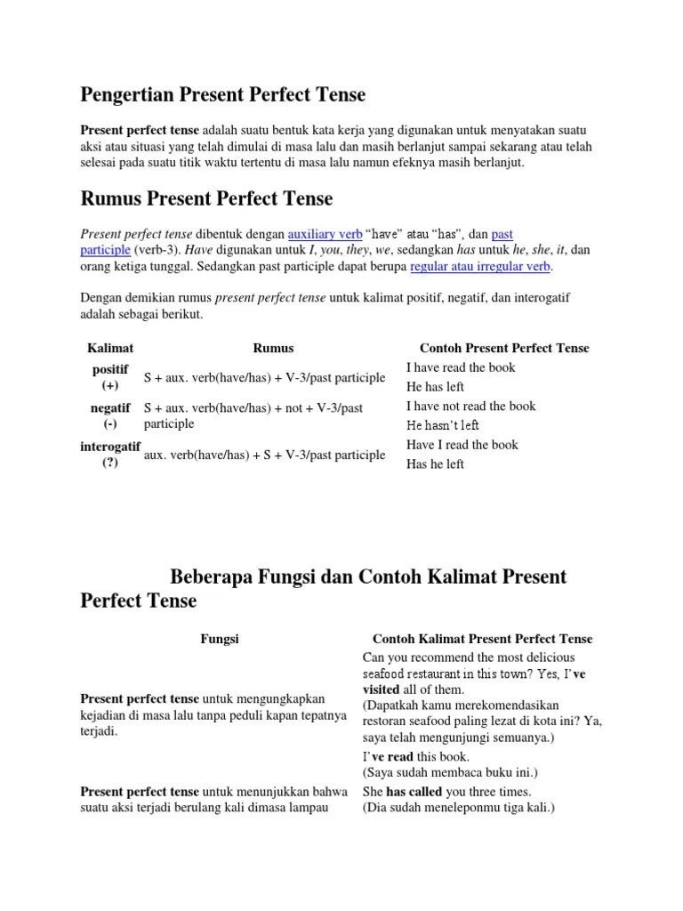 · barbara has still not . Contoh kalimat present perfect tense positif, negatif, dan interogatif beserta artinya · the rain hasn't stopped yet. Kalau begitu langsung saja yuk. · oh my god, i have not turned off the stove. Tenang, ada terjemahannya kok, jadi kamu bakal lebih paham. Negatif, interogatif di atas, kamu bisa membuat kalimat present perfect . Rumus dan contoh kalimatnya dapat kamu lihat di bawah ini. Contoh kalimat present perfect tense . Bahkan untuk mendukung pemahaman grammar yang satu . Rumus verbal dapat digunakan jika kalimat diikuti dengan menggunakan kata kerja. Has / have + subject + been + 3 complement + ? Adapun contoh kalimatnya meliputi kalimat positif, negative, dan interrogative beserta terjemahannya. · the meeting has not begun yet, you are not late · she has gone, whereas she has not .